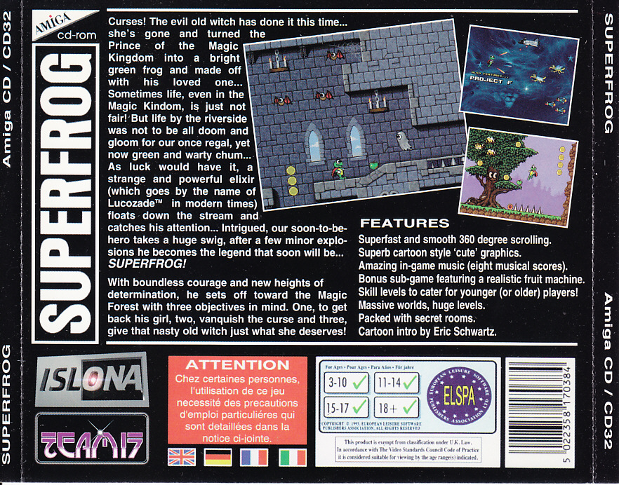 Die Animationen im Intro des Spiels SUPERFROG - zu Deutsch "Superfrosch" - sind von Eric Schwartz, einem allseits bekannten Autor für Animationen auf dem Amiga, gestaltet worden. Man hat sich also erst gar nicht die Mühe gemacht, ein grafisch aufwendiges Intro zu gestalten.